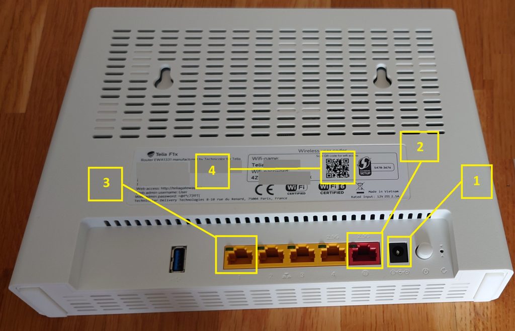 - 3. Här ansluts enheter i lägenheten som använder nätverkskabel (fyra uttag). Koppla gärna in Telia Play-boxen med hjälp av den medföljande nätverkskabeln här i ett av de fyr uttagen.