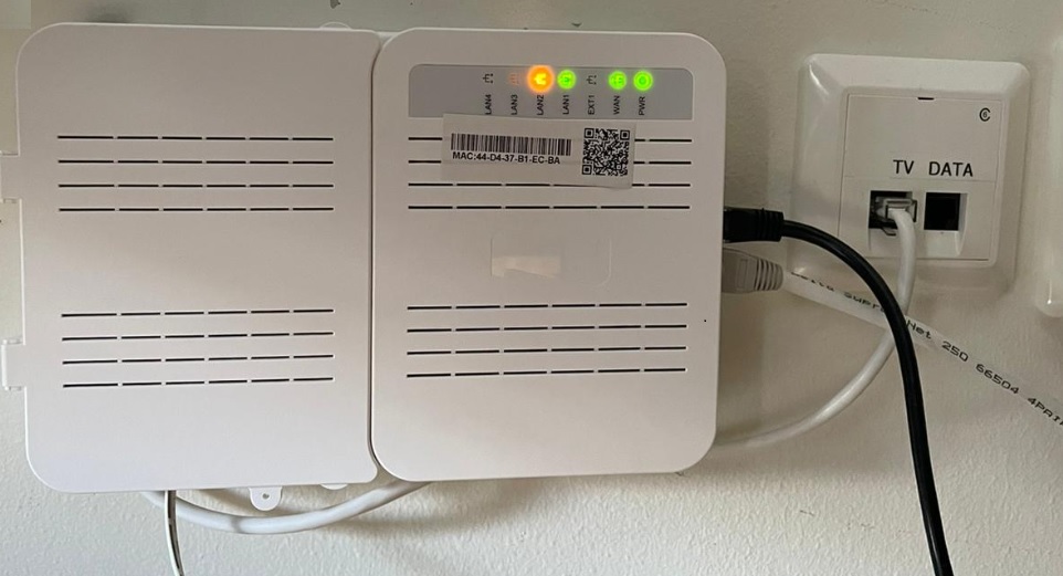 På bilden ovan framgår det att en svart sladd (från TV-boxen) och en grå sladd (från en router) är kopplade till mediaboxen, samt att mediaboxen är ansluten till uttaget märkt ”TV”. Denna mediabox installerades i oktober 2022.