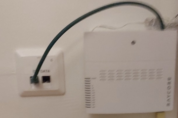 I varje lägenhet finns finns en mediabox (även kallad bredbandsbox eller mediaomvandlare) av fabrikatet Raycore. Mediaboxen får sin strömförsörjning genom en 230V-adapter som ska vara kopplad till boxen. Boxen har också en kort nätverkskabel med en RJ45-kontakt som ska kopplas in till lägenhetens nätverksuttag i den kontakt som är märkt ”TV”. Se bilden nedan.